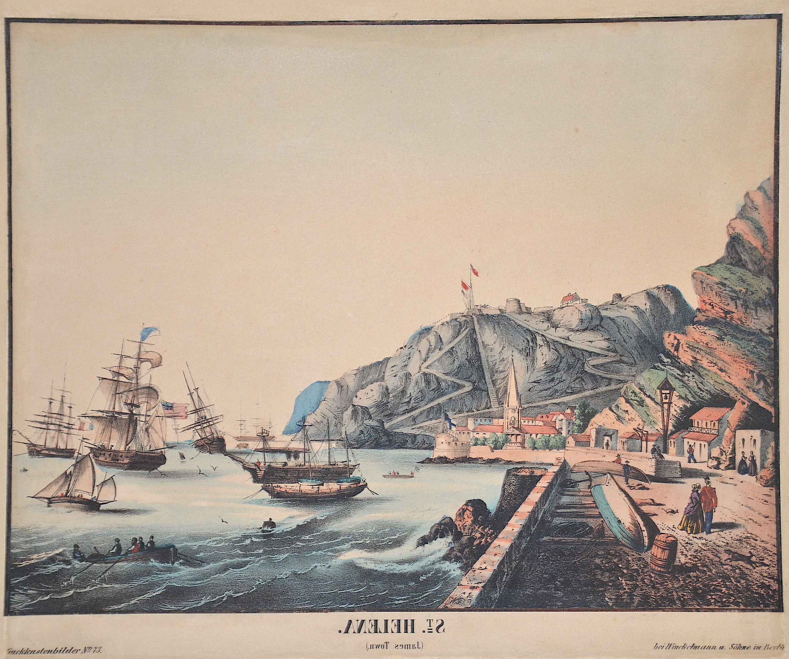 Description | Peep-box view showing the town of Jamestown on St Helena with sailing ships in the foreground. |