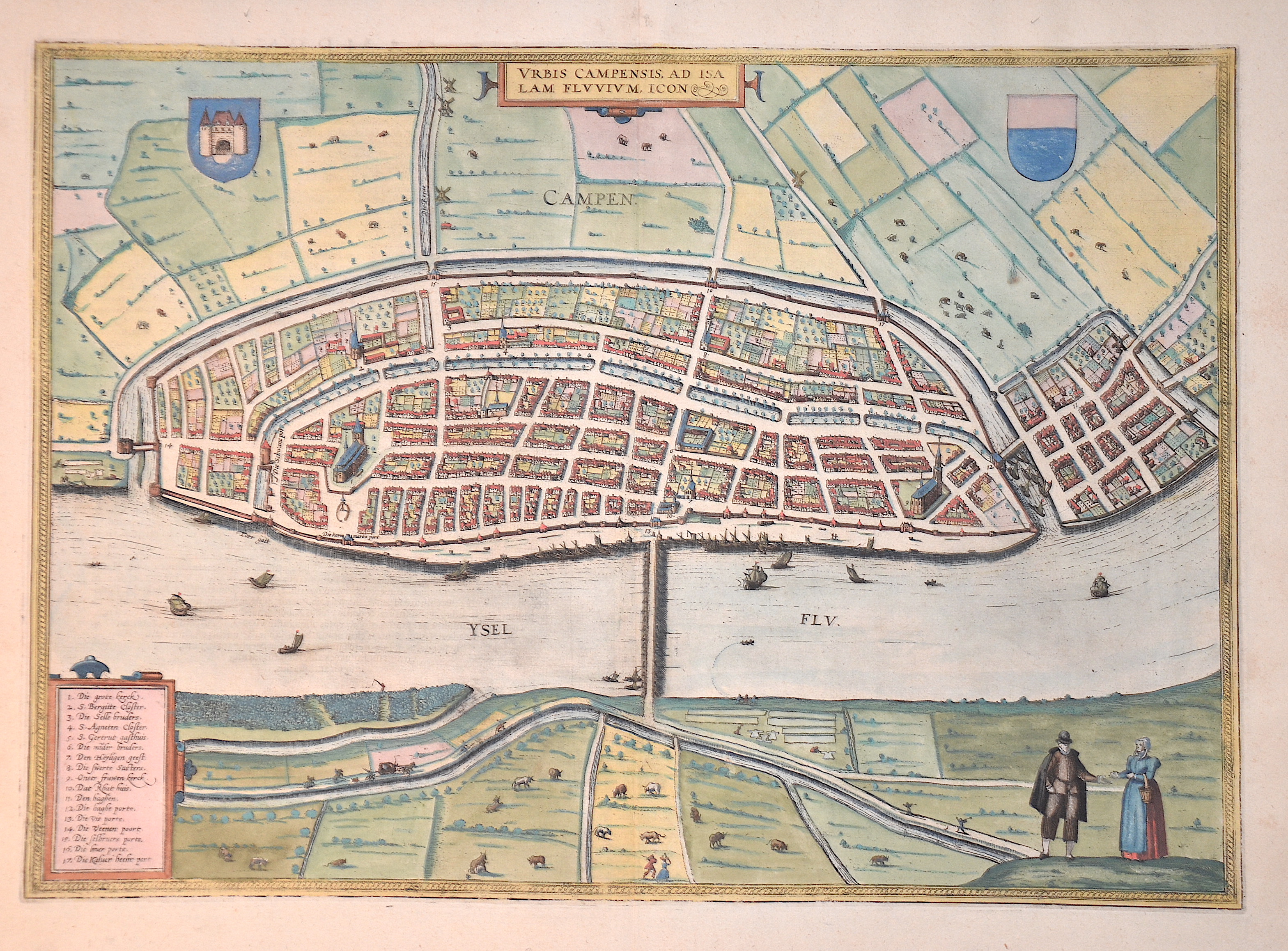 Description | Map shows a bird's eye view of the town of Kampen. At that time a Hanseatic town in the Dutch province of Overijssel. At the top left the coat of arms of Kampen and on the right the flag colours in the coat of arms. There is also a title cartouche and a city index. Text in Latin on reverse. |